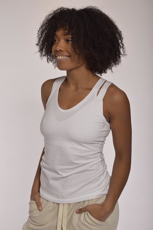 Slim-Fit-Modell Wrapper in Weiß mit gekreuzten Trägern hinten.