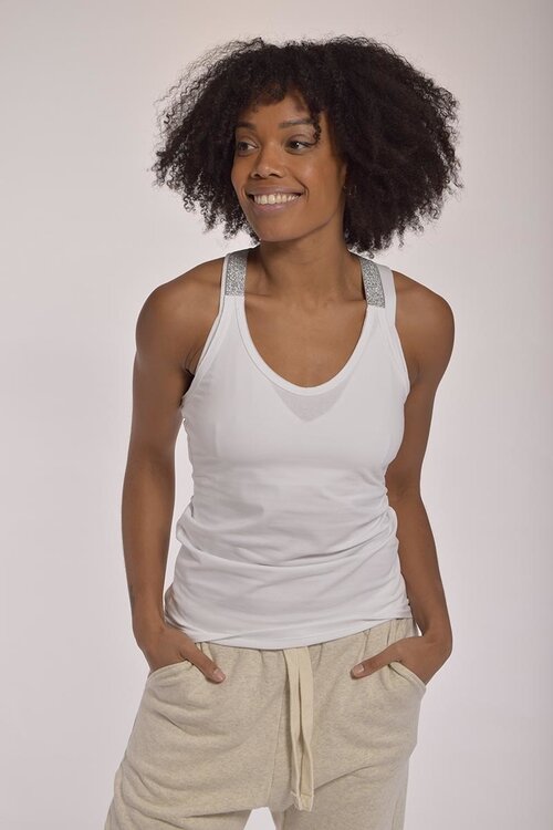 Slim-Fit-Modell Wrapper, weiß mit silbernen Lurex gekreuzten Trägern auf dem Rücken.