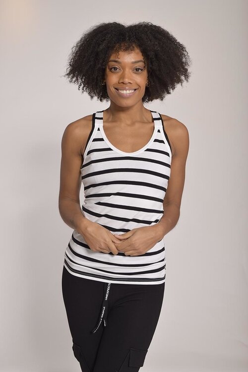 Slim-Fit-Modell-Wrapper mit horizontalen schwarz/weißen Streifen und gekreuzten Trägern hinten. <br />Hergestellt aus Bio-Baumwolle und der Ausschnitt hat ein Vintage-Finish. <br />Ideal, um es unter jedem Look zu tragen, dank der bequemen Passform und de Lesen Sie mehr.