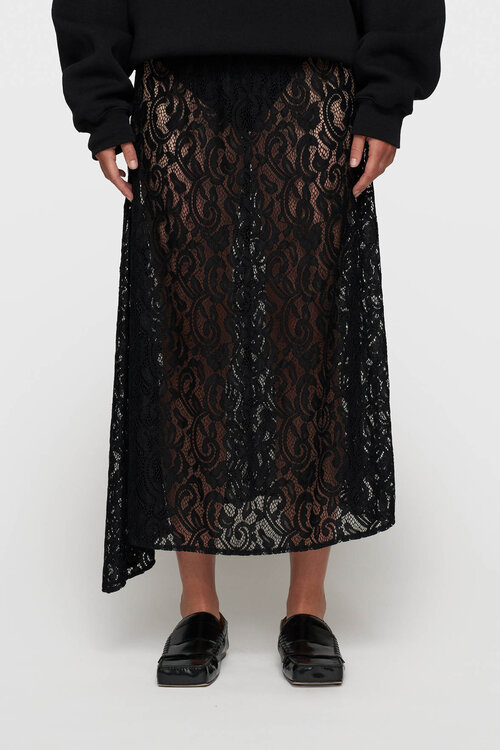 Locker sitzender Spitzen-Midi-Rock mit elastischem Bund und asymmetrischem Saum.