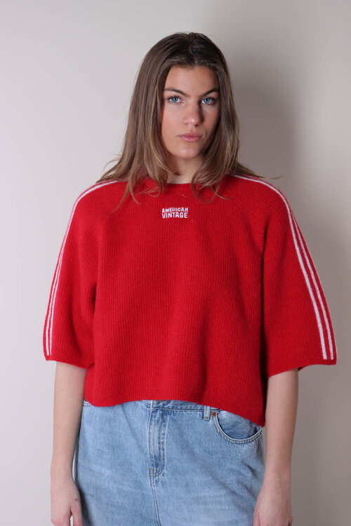 Auf der Suche nach einem Statement-Strick für das Frühjahr? Der Vitow Damenpullover von American Vintage in China Karmesin kombiniert eine luxuriöse Alpaka-Wollmischung mit einem sportlichen Streifen am Ärmel.