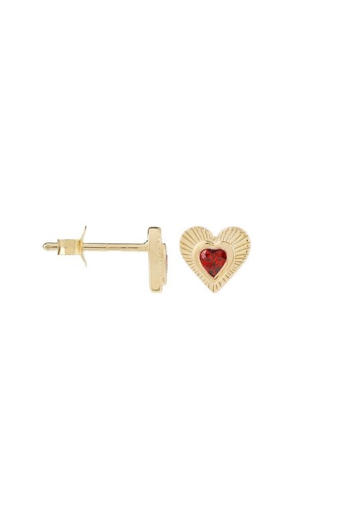 Der Single Rhapsody Love Stud von Anna & Nina ist eine subtile Ode an die Liebe. Diese zarten Ohrstecker sind in Form eines Herzens gestaltet, mit einem funkelnden roten Stein in der Mitte, der sich wunderschön gegen die goldene Fassung abhebt. Die feinen Linien um das Herz verleihen zusätzliche Tiefe und sorgen für ein zeitloses Erscheinungsbild.