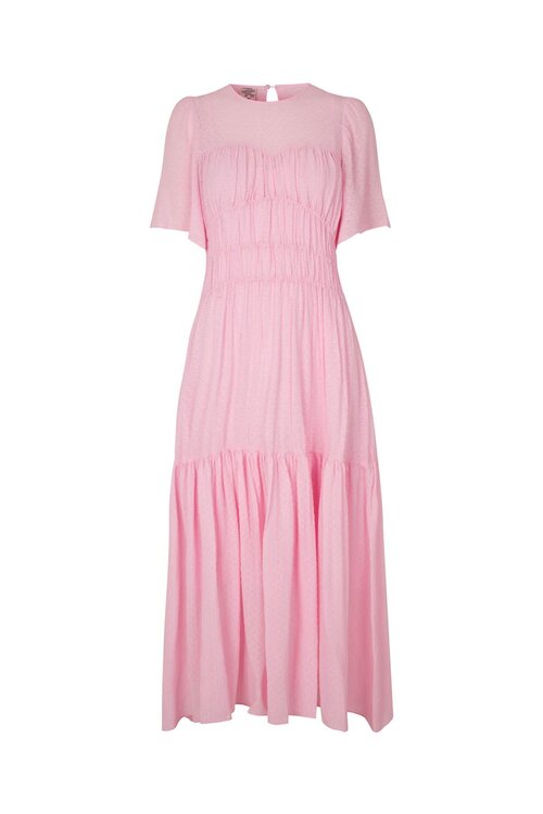 Das Kleid Anissa ist ein weiches, halbtransparentes Kleid mit Textur und elastischen Streifen überall. Es besteht aus 100% Viskose und hat eine normale Passform. Das Kleid reicht bis zu den Knöcheln und hat einen Schlüssellochausschnitt mit Knopf am Hals. Das Kleid ist in der Farbe Parfait Pink erhältlich. Dieses Kleid ist perfekt, um es mit ein paar Stiefeletten oder Absätzen zu stylen. Für einen lässigeren Look kannst du das Kleid mit ein paar Sneakers und einem übergroßen Pullover kombinieren.
