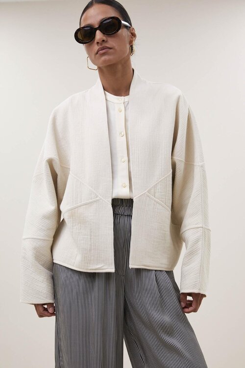 Die flora cotton jacket von by-bar ist eine moderne, kurze Jacke mit einer boxy Passform und weicher Struktur. Dank der offenen Vorderseite, breiten Ärmeln und minimalistischen Ausstrahlung ist diese Jacke ideal, um jedem Outfit sofort einen stilvollen, zeitgemäßen Look zu verleihen.