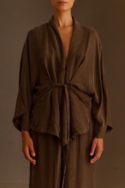 Das Yeno’CL Top von Club L’Avenir ist ein elegantes Wickeloberteil in der tiefen, warmen Farbe Schokolade. Das Wickelmodell mit Bindegürtel betont die Taille auf subtile Weise, während der fließende Stoff und die weiten Ärmel für einen raffinierten, modernen Look sorgen. Ein zeitloses Stück, das Luxus und Einfachheit perfekt kombiniert.