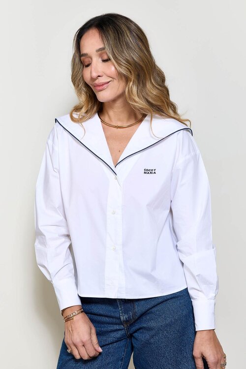 Weiße CAMISA MARINA Bluse von Coco y Maria mit Kontrastdetail am Kragen. Baumwollmischung mit Stretch für zusätzlichen Komfort. Bestellen Sie bei Van Dort Mode! Lesen Sie mehr.