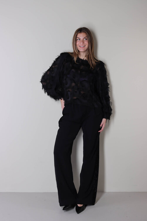 Die Syra Structure Blouse von Co'Couture ist ein echter Hingucker. Der schwarze transparente Stoff mit 3D-Struktur und Rüschen verleiht dieser Bluse einen einzigartigen, luxuriösen Look.