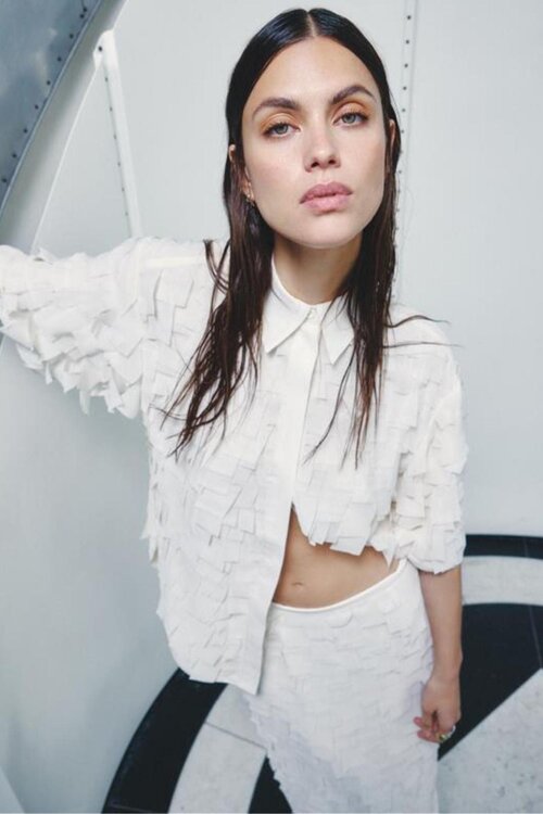 Die quadratischen Stofffransen über die gesamte Bluse verleihen Textur und eine verspielte Bewegung.