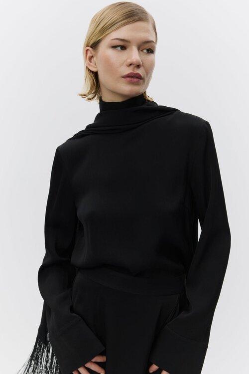 Die DAY Birger et Mikkelsen Rios Tunika Top in Schwarz ist ein raffinierter High-Neck-Top mit einem modernen, eleganten Look. Der semi-fitted Schnitt, große Manschetten und der abnehmbare Schal mit Fransen machen dies zu einem markanten Statement-Stück.