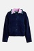 • Marineblaue Strickjacke mit lila und dunkelgrünem Rüschenkragen