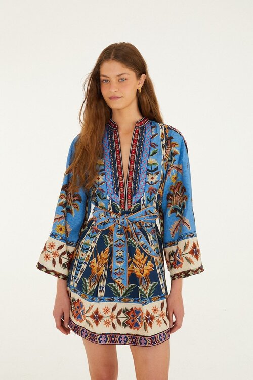 FARM Rio Blaues Besticktes Tapestry Mini-Kleid aus Bio-Baumwolle