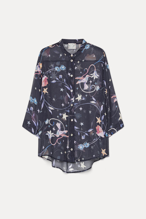 Die Kombination aus dem tiefen Dunkelblau, dem raffinierten Print und dem Viskose-Seiden-Stoff sorgt für einen luftigen und luxuriösen Look.