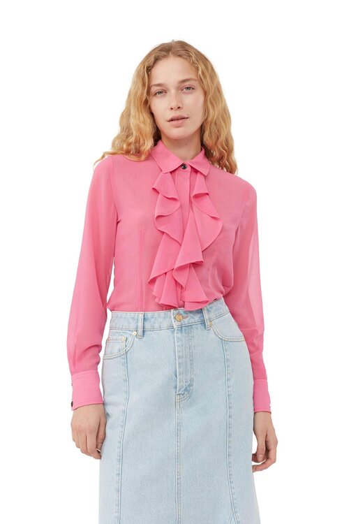 Dieses rosa Chiffon-Rüschenhemd ist aus recyceltem Polyester gefertigt. Lesen Sie mehr.