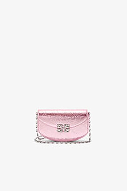 GANNI Tasche mit zerknitterter Metallic-Textur, abnehmbarem Kettenriemen und Butterfly-Logo. Kompakt und stilvoll mit Kartenfach innen. Shoppen bei Van Dort Mode. Lesen Sie mehr.