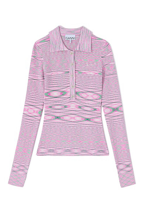 GANNI Spacedyed Strick-Poloshirt aus Viskosemischung mit Knopfleiste und geteilten Manschetten. Leicht, auffällig und stilvoll. Shoppen Sie bei Van Dort Mode! Lesen Sie mehr.
