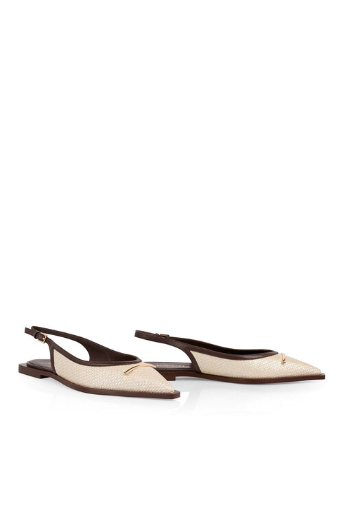Diese Marc Cain Slingback-Ballerina in Dark Wood kombiniert eine raffinierte spitze Form mit einer sommerlichen Raffia-Mischung und luxuriösem Leder für einen eleganten, komfortablen Look.