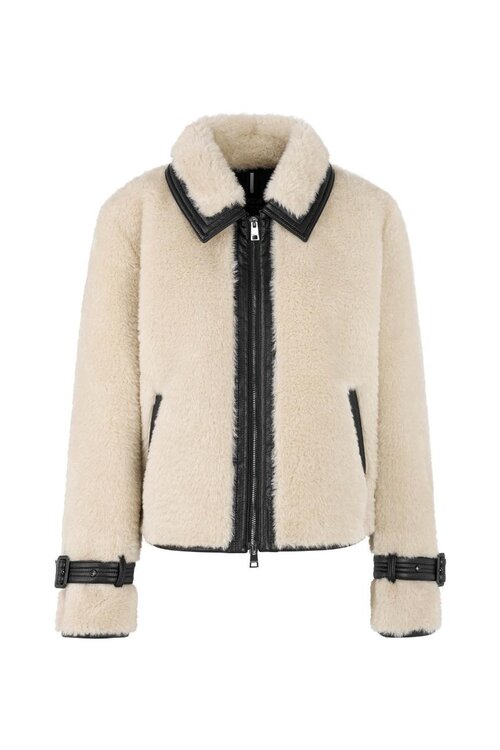 Kunstpelzjacke in hellem Ecru mit Gürtel-Detail und Reißverschluss. Warme, gerade geschnittene Außenjacke Lesen Sie mehr.