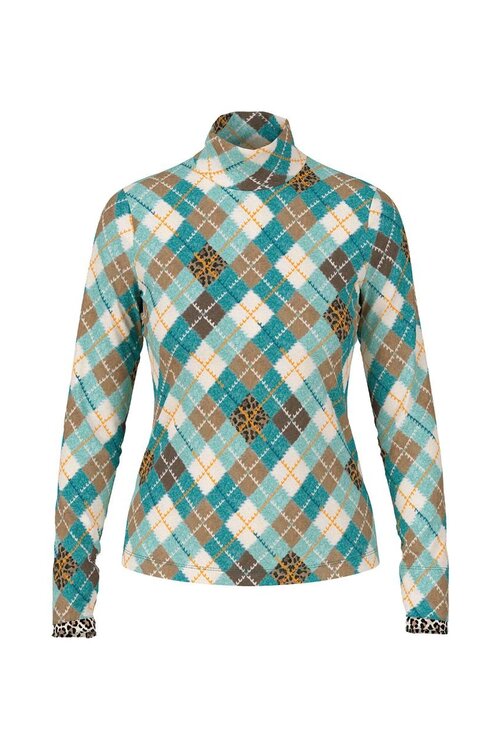 Dieses taillierte Shirt von Marc Cain Sports kombiniert ein klassisches Argyle-Muster mit verspielten Leopardenakzenten und einem komfortablen Rollkragen.