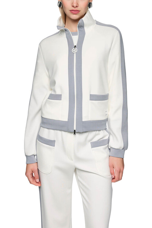 Diese off-white Mon Cherry Jacke von Marccain hat dank des geraden Schnitts, der kontrastierenden Streifen und der weichen Jerseystruktur eine moderne, sportliche Ausstrahlung.