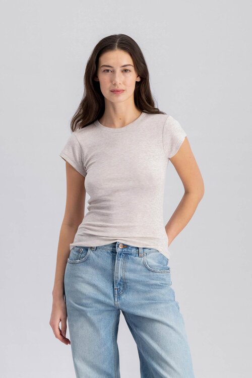 Neeve The Mika in Beige Melange: butterweiches Rippenoberteil mit Kappärmeln und enganliegendem Rundhalsausschnitt. Federleicht und schick. Shoppen bei Van Dort Mode. Lesen Sie mehr.