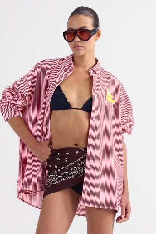 Die Kombination aus klassischen rot-weißen Streifen und der verspielten Bananenstickerei verleiht dieser Bluse einen unverwechselbaren und eigenwilligen Look.