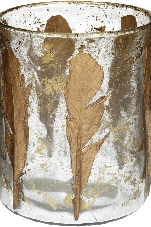 Stimmungsvoller Glasteelichthalter mit handgefertigtem Look: transparentes Glas, verziert mit goldfarbenen Federakzenten für warmes, funkelndes Kerzenlicht.