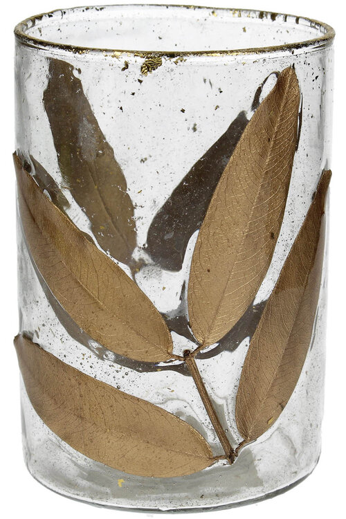 Glasvase von VAND. Lifestyle mit goldfarbenem Blattdekor – kompakt und stilvoll für jedes Interieur.