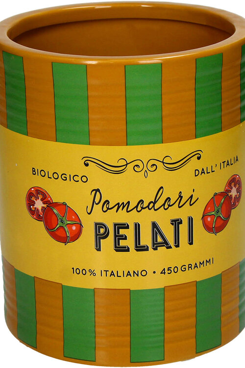 Die Vase ist inspiriert von klassischen italienischen Verpackungen von geschälten Tomaten – eine Hommage an la dolce vita.