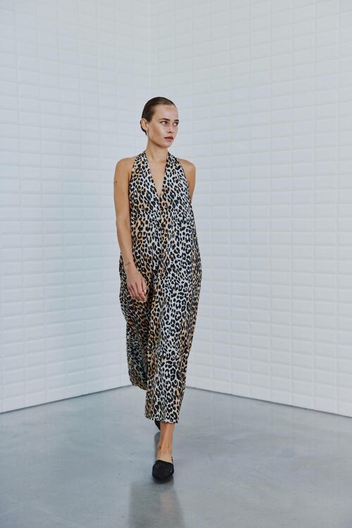 Die Kombination aus dem auffälligen Leopardenmuster und der fließenden Silhouette macht dieses Kleid zu einem echten Hingucker.