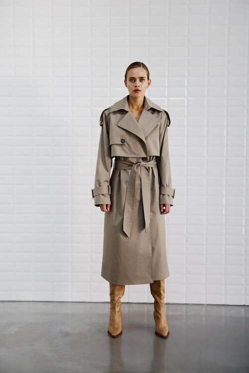 Entdecken Sie die skandinavische Einfachheit von WithBlack bei VAND. Lifestyle und entscheiden Sie sich für einen zeitlosen Trenchcoat in Grey Sand.